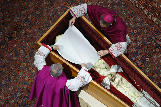 Nous publions les photos du rite émouvant de la velatio [/du voilement] : le maître de cérémonie Mgr Diego Ravello (en tenue de chœur) et le Préfet de la Maison pontificale S. E. Mgr Georg Gänswein placent un voile blanc sur le visage de la dépouille du Pape émérite, alors que le rite funéraire solennel sur la Place Saint-Pierre vient de se terminer.