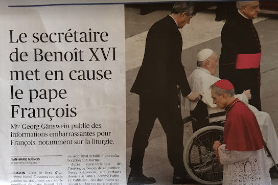 Dans la lettre d’accompagne­ment du motu proprio « traditio­nis custodes», du 16 juillet 2020, François assurait pourtant que sa décision rejoignait « l’intention » de Benoît XVI, laissant entendre qu’il avait été associé au saborda­ge de sa propre réforme phare, publiée par le Motu Proprio Sum­morum Pontificum, du 7 juillet 2007. Ce que récuse avec force ar­guments son ancien secrétaire, Ganswein : il affirme que le pape émérite a « découvert» la publica­tion de ce décret du pape François le jour même, le 16 juillet 2020, «en feuilletant l’Osservatore ro­man », le quotidien du Saint­-Siège. Le secrétaire particulier ex­plique ensuite que le pape émérite, tout en respectant « la responsabilité de la décision » de son successeur, y voit, « à titre personnel», un «changement de cap décisif » qu’il estime être « une erreur ». Car « la tentative de paci­fication » que  Benoît XVI a voulu mettre en acte est « mise en pé­ril », explique Gänswein. Il ajou­te : « Benoît pense qu’il est erroné d’interdire la messe selon l’ancien rite dans les églises paroissiales, parce qu’il est toujours dangereux de mettre un groupe de fidèles dans un coin, les conduisant à se sentir persécutés et leur inspirant la sen­sation qu’ils doivent sauvegarder à tout prix leur propre identité face à « l’ennemi » ».