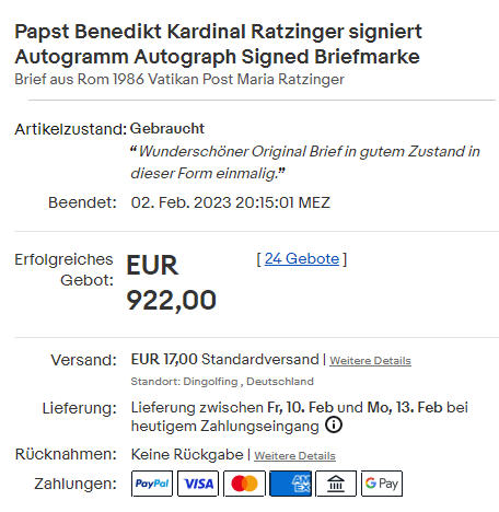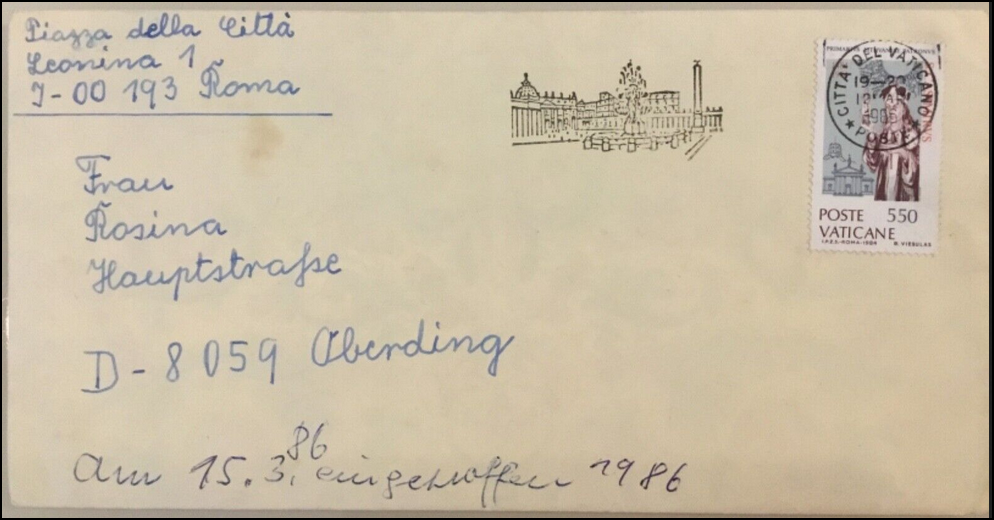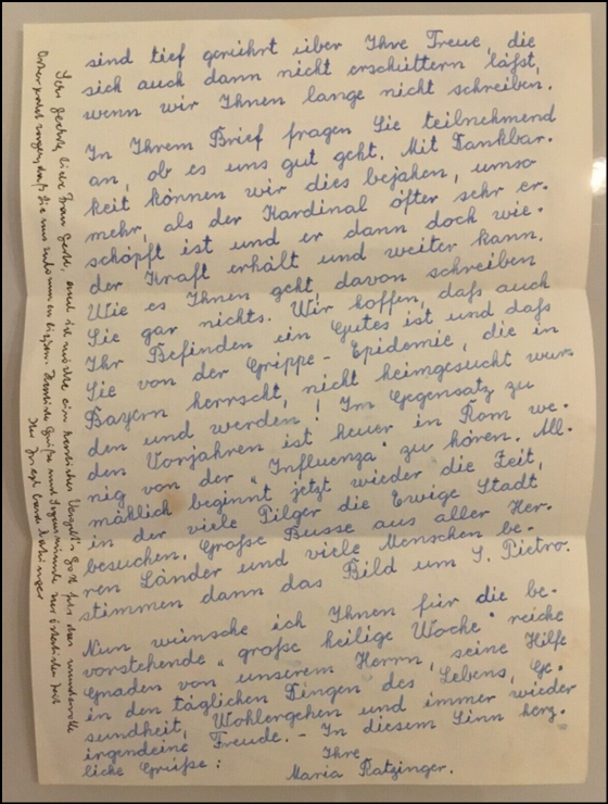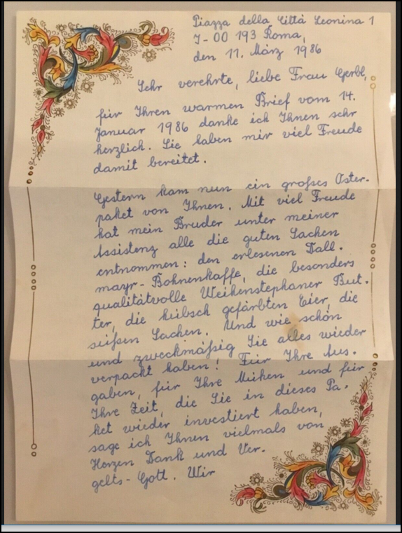 voici une lettre de la sœur Maria et du Cardinal Ratzinger, envoyée le 11 mars 1986 de Rome à une connaissance, une épicière en Bavière, qui leur avait envoyé un colis pour Pâques.