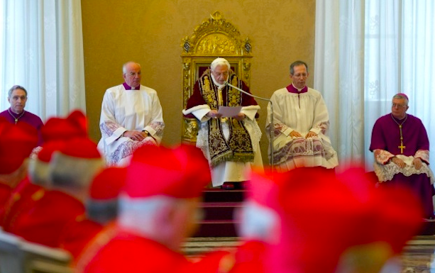 Benoît XVI lit le texte de la renonciation, lors du consistoire du 11 février 2013