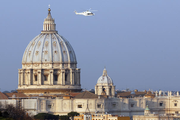 Un hélicoptère blanc de l’armée de l’air italienne accompagne le pape à l’héliport. Benoît le rejoint dans une voiture noire, immatriculée SCV 1, qui glisse silencieusement le long des jardins du Vatican. Encore quelques salutations, des sourires et des poignées de main. Puis le pape, accompagné de ses plus proches collaborateurs, monte à bord, et à 17 h 07, le décollage a lieu.
