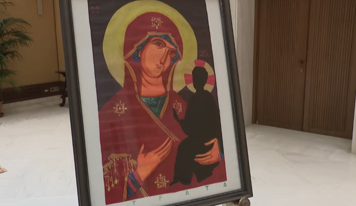 L’ « artiste » a « gribouillé une très laide icône de la Mère de Dieu d’Iveron, en laissant vide la place du Christ. Il l’a intitulée ‘Perte’, et il a expliqué : ‘Cette œuvre parle de la perte d’enfants ukrainiens dans la guerre d’agression que la Russie a déclenchée contre l’Ukraine’ « .