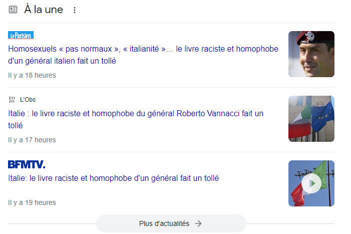 Un général italien encore en activité, Roberto Vannacci [1], a écrit un pamphlet qui dénonce « le monde à l’envers » (c’est le titre du livre) dans lequel nous vivons. Apriti cielo, comme disent les italiens. Tout ce que le pays compte d’opinionistes, d’ « intellectuels » et de journalistes, tous évidemment de gauche (mais, je me répète, c’est un pléonasme), lui est tombé dessus avec une belle unanimité. AM Valli en parlait aujourd’hui, et ce qu’il dit permet de se faire une idée sur le motif de leur fureur. Le sujet m’a paru intéressant, susceptible d’engendrer une réflexion plus large (notamment sur l’arrivée au pouvoir d’un gouvernement réputé « d’extrême-droite »), mais je pensais que la polémique se cantonnerait à l’Italie. Que nenni! La capture d’écran faite aujourd’hui sur les actualités de Google montre qu’elle a franchi les Alpes, et sans doute l’océan, et qu’il y une véritable internationale de la censure politiquement correcte.