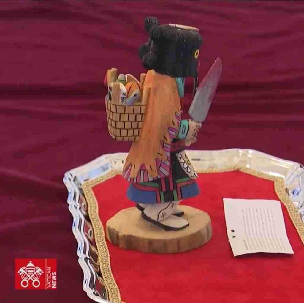 La Directrice du Programme Alimentaire Mondial des Nations Unies remet au Pape une idole indienne Kachina