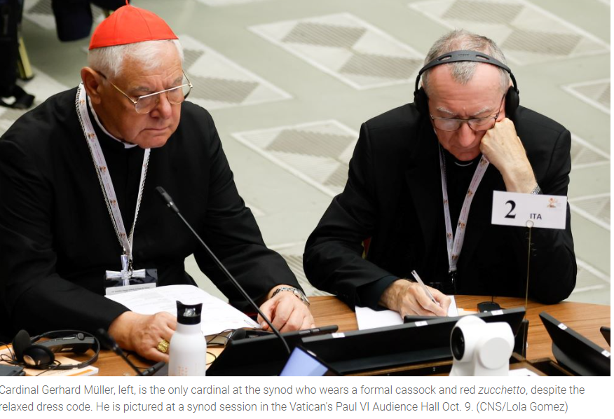 Le synode semblait s’être endormi dans une routine léthargique tellement sans intérêt que des participants avaient semble-t-il déclaré forfait, ayant mieux à faire. Pendant ce temps là, le cardinal Müller s’était fait remarquer par les bergogliens de service (avec une condescendance ironique) juste pour être le seul à avoir endossé la soutane distinctive de sa charge.