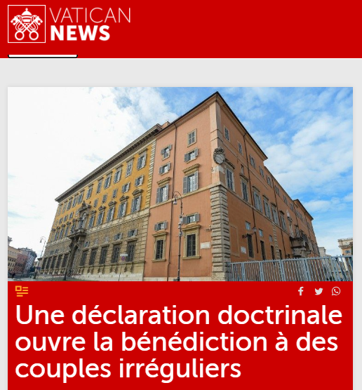 La nouvelle brute, telle quelle est annoncée bien hypocritement [1]) (pour que le dernier carré des bergogliens puisse faire, au moins, des triples salto arrière afin de justifier l’indéfendable) sur le portail Vatican News, ne laisse aucune place au doute, même si on a cru jusqu’au bout que « ce n’était pas possible« . Voilà le sens de la nomination de Tucho à la Doctrine: « la déclaration ‘Fiducia supplicans’ approuvée par le pape et signée par le cardinal Fernández donne le feu vert à la bénédiction des couples irréguliers, y compris les couples de même sexe » [admirez le « y compris », alors que le texte n’est QUE pour eux et que les autres « couples irréguliers » ne sont là que pour faire la claque!!).