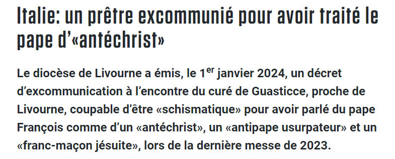 La nouvelle a fait le tour du réseau, y compris à l’étranger, car tout ce qui peut illustrer le chaos dans l’Eglise fait le miel des médias. Un prêtre italien a été excommunié latae sententiae pour avoir prononcé lors de l’homélie du 31 décembre des propos jugés inacceptables contre le pape. La décision est juste, dit Luisella Scrosatti. En d’autres termes, il ne l’a peut-être pas volé. Mais cela ne doit pas cacher le fait qu’il y a actuellement dans l’Eglise un vrai problème… et que ce problème s’appelle Bergoglio
