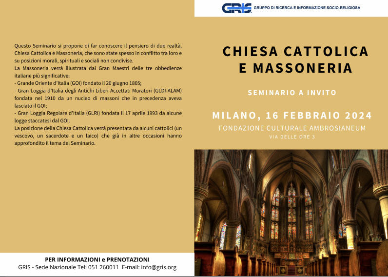 C’est l’essentiel de la « rencontre historique » organisée par le GRIS [Gruppo di Ricerca e Informazione Socio-religiosa, ndt] – avec un public sélectionné et fermée à la presse – qui s’est déroulée vendredi dernier, 16 février, à Milan en présence de représentants qualifiés de l’Église et de la franc-maçonnerie : d’une part les trois Grands Maîtres des trois loges italiennes – Stefano Bisi pour le Grand Orient d’Italie (GOI), Luciano Romoli pour la Grande Loge d’Italie de l’ALAM (GLDI) et Fabio Venzi (en connexion depuis Rome) pour la Grande Loge Régulière d’Italie (GLRI) -, d’autre part l’archevêque de Milan Mario Delpini, le cardinal Coccopalmerio déjà cité, le théologien franciscain Zbigniew Suchecki et, surtout, l’évêque Antonio Staglianò, président de l’Académie pontificale de théologie et véritable star de l’après-midi.
