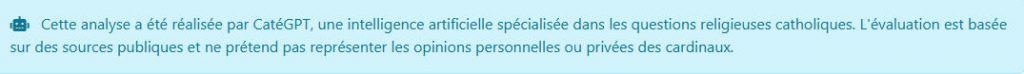 Une fois admis le fait que l’élection d’un Pape ne se réduit évidemment pas à une affaire de chiffres, il faut reconnaître que c’est simple, efficace et relativement fiable (si biais il y a, il intervient au niveau des critères retenus et de leurs poids respectifs): on entre un nom, le score sort immédiatement. Par exemple le cardinal Tucho Fernandez obtient une note de 12/100, juste devant le Luxembourgeois Hollerich et l’Américain McElroy (tous deux 11/100), les plus progressistes; et le plus traditionaliste, le cardinal Burke obtient 96/100, devant les cardinaux Sarah (88), Ranjith (78) et Müller (78).