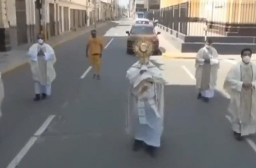 – Et comme si tout cela ne suffisait pas, regardez la photo [en haut]. Lorsque les églises étaient fermées en raison de la panique liée au COVID, l’évêque de Chiclayo d’alors se promenait dans les rues vides pour bénir les maisons avec le Saint-Sacrement.
