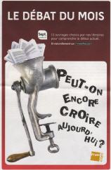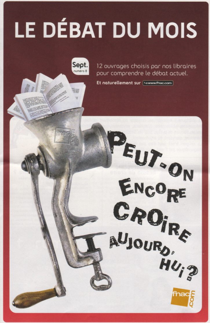 C'est le débat du mois, à la Fnac. Il est illustré et développé dans un dépliant, mi-publicité, mi-tract (dont l'image sur la première page me laisse perplexe), sous le haut patronnage de Monsieur Tincq. Drôle de débat, qui a attiré mon attention alors que je passais au magasin Fnac de ma ville, et y visitais le rayon "religion et spiritualités" (orthographe non garantie, je ne me souviens plus si c'est au pluriel), dont j'ai déjà parlé avec lassitude.