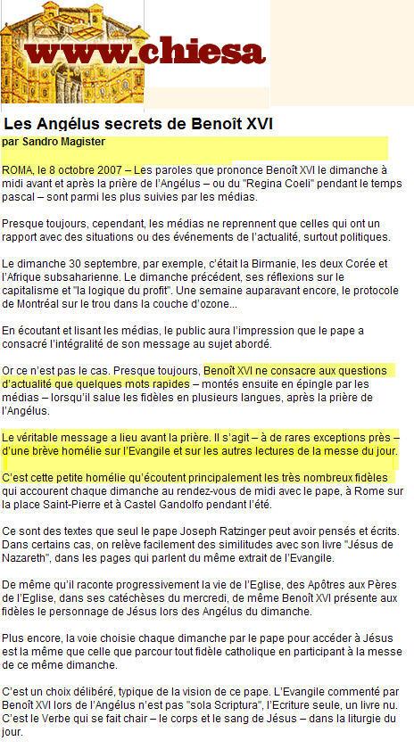 Chaque dimanche, à midi pile, avant la prière d'Angelus, il y a une "petite homélie" de 5 minutes, retransmise sur KTO, et sur RAI UNO - que, par le biais du câble, du satellite, et d'Internet, pas mal de gens, en France, doivent être en mesure de capter. On en parle peu. Et puis il y a le "post Angelus". Qu'il y évoque la situation au proche Orient, l'état de la planète, ou même les accidents de la circulation, et ses propos sont plutôt bien relayés. Tant mieux. Ils sont "utiles", ceci explique cela. Mais la pensée du Saint-Père ne m'appartient pas davantage qu'aux rares supports d'information qui s'en font l'écho en France. Et surtout, elle ne se laisse pas enfermer dans un cercle aussi étroit.