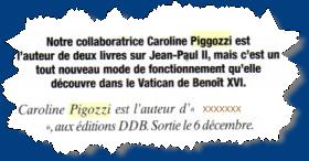 « Ainsi après l'avoir suivi de façon privilégiée, ayant l'honneur d'être reçue par lui à la fin du reportage, alors que je lui avais fait porter auparavant mon dernier livre qui sort cette semaine chez le même éditeur que lui, et qu'il évoquait avec moi chaleureusement le sujet, j'osais lui avouer qu'il m'entraînait à faire un péché d'orgueil. « Mais non, me répondit-il de sa voix douce me prenant les mains, cela prouve juste que vous êtes un écrivain sérieux. » Ce matin du 29 novembre, l'émotion était très forte. J'osais néanmoins lui indiquer que nous allions publier ce reportage cette semaine. Il me regarda alors avec autant de calme que de bonté et me dit serein: « Cela n'est pas urgent. Ici, le temps n'a pas pour nous la même signification, il y a deux mille ans que nous fonctionnons ainsi. » En quittant ces lieux aussi imposants que silencieux, où seuls raisonnent les pas rythmés des dignes gardes suisses, j'avais soudain eu l'impression de commencer à comprendre quelle était la clé du successeur de saint Pierre. »