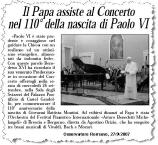 [Dans l'après-midi du 26 septembre], le Pape a assisté à Castelgandolfo au concert donné par l'Orchestre du Festival Benedetti Michelangeli de Brescia et Bergame pour le 110ème anniversaire de la naissance de Paul VI, originaire de cette région. "Ces célèbres pièces musicales -a dit Benoît XVI après leur exécution- sont l'occasion de nous rappeler d'un Pape illustre qui a rendu à l'Eglise et au monde un service précieux, dans une période difficile où la société subissait des mutations profondes, culturelles et religieuses".