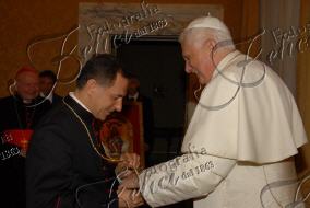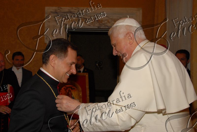 Mgr Mieczyslaw Mokrzycki, un polonnais, connu à Rome comme “Don Mietek”, a été l’assistant personnel de Jean-Paul II de 1996 à sa mort, le 2 avril 2005, et ensuite de Benoît XVI. ------------------- "Don Mietek", discret et compétent, que l'on aperçoit brièvement dans le reportage de la RAI "Il Papa dell'amicizia con Dio" a donc été récompensé de son dévouement en recevant des mains de Benoît XVI la croix épiscopale. Le 24 septembre, Le Saint-Père recevait les prélats de la Conférence épiscopale latine d'Ukraine, venus en visite Ad Limina, en présence de leurs confrères ukrainiens de rite byzantin. "Don Mietek" était parmi eux. Sheelagh a déniché pour moi sur le site de fotografia Felici ces images très émouvantes.