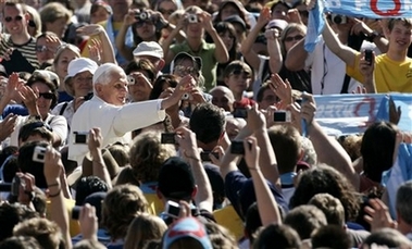 Una grande folla ha accolto Benedetto XVI in piazza San Pietro per il tradizionale appuntamento dell'Udienza Genrale. Tutti i settori sono infatti gremiti e si puo' stimare in circa 40 mila persone il numero dei presenti, dei quali solo la meta' avevano chiesto nei giorni scorsi il biglietto alla Prefettura della Casa Pontificia. Arrivato da Castelgandolfo in elicottero, Papa Ratzinger ha iniziato alle 10,30 il consueto giro sulla jeep bianca scoperta tra i pellegrini. (source: AGI, sur le site Yahoo Italia Notizie)