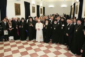 La réunion d'aujourd'hui nous ramène idéalement à 1986, lorsque mon vénéré prédécesseur, le Pape Jean-Paul II a invité de hauts représentants religieux dans les collines d'Assise pour prier pour la paix, soulignant en ces circonstances, les liens intrinsèque qui unissent une attitude religieuse authentique et une vive sensibilité pour le bien fondamental de l'humanité. En 2002, après les événements dramatiques du 11 septembre de l'année précédente, le même Jean-Paul II a rappelé les chefs religieux à Assise, à demander à Dieu d'arrêter les graves menaces qui entourent l'humanité, en particulier en raison du terrorisme.
