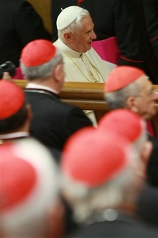 Andrea Tornielli. Texte original en italien (Il Giornale). Ma traduction Ce matin à Saint-Pierre, Benoît XVI créera 23 nouveaux cardinaux, parmi lesquels le président de la CEI Bagnasco. Et hier, comme c'est maintenant la tradition, le Pape a voulu discuter avec tous les 'porporati' sur quelques thèmes d'actualité de la vie de l'Église. L'argument du débat, qui s'est tenu à huis-clos, a été le dialogue oecuménique avec les chrétiens des autres confessions. On a vu émerger la volonté de collaborer avec les autres chrétiens pour défendre la vie et la famille, et chercher à endiguer le sécularisme.