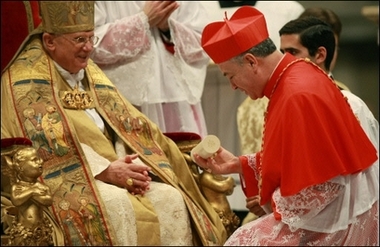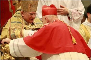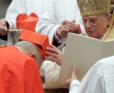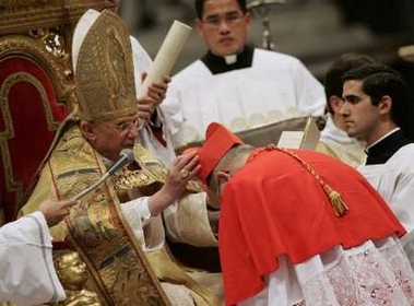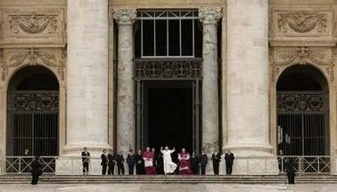 La cérémonie de remise des "barrettes" rouges aurait dû se dérouler à l'extérieur, mais en a été empêchée par un vent fort et une température glaciale - pour Rome! Délicatesse du Saint-Père, qui est venu saluer sur le parvis les nombreux fidèles ayant assisté à la cérémonie sur les écrans géants. Information sur le blog de Raffaella: (traduction)