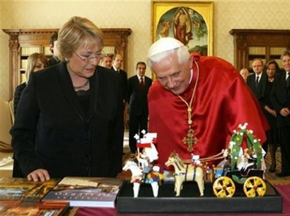 Le 18 octobre, le Saint-Père a reçu Michelle Bachelet, la présidente socialiste du Chili.J'aime (malgré tout) beaucoup cette jolie photo (AP, papacy and the Vatican on Yahoo).
