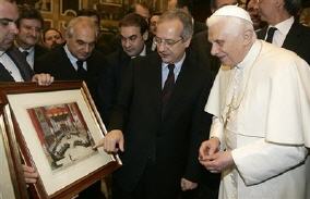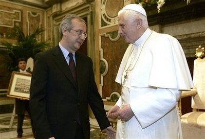 Ce 10 janvier, Benoît XVI a reçu les voeux des représentants de la ville de Rome, de la province du Latium, et de la Région. La situation est très semblable à celle de la France, l'optimisme de la classe politique aussi, et jusqu'à leur discours (on observera avec amusement que le maire de gauche Walter Veltroni y a été, de son petit couplet sur la " civilisation de paix", qui évoque furieusement la "politique de civilisation" de notre nouveau penseur national). Le Pape, évidemment, n'énonce pas de formules aussi creuses. Il dit, avec des mots simples, des choses belles et concrètes, se préoccupant vraiment, avec sensibilité et humanité, du sort des gens. C'est, en substance, ce qu'il avait déjà dit en juin dernier lors de la Rencontre Ecclésiale avec le Diocèse de Rome, évoquant encore l'urgence éducative, la perte des repères (le rôle des medias), et la place de la famille.