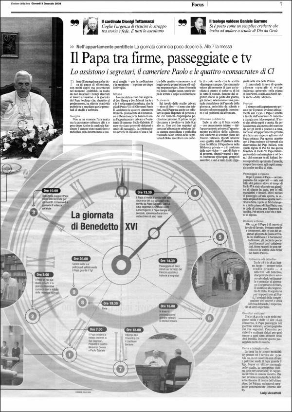 La seconde page, sous la signature du (vrai) vaticaniste Luigi Accattoli, propose un excellent "diagramme" (que je reproduis en fac similé, faute d'un terme plus approprié pour le qualifier, qui m'échappe) décrivant heure par heure la vie quotidienne du Saint-Père dans le palais apostolique. Cela reprend -mais avec beaucoup de détails inédits- le film document de la RAI, "Il Papa dell'amicizia con Dio". Je n'ai aucun doute que tout soit authentique et véridique. Et il ne s'agit d'aucune curiosité malveillante, contrairement à d'autres articles que j'ai lus, en particulier dans certains journaux français. Après tout, si on aime quelqu'un, il est tout à fait légitime de désirer savoir comment il vit.