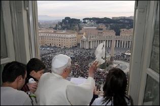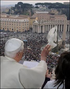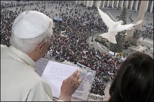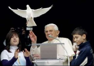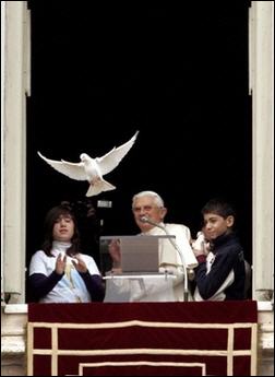 Le pape Benoît XVI a libéré dimanche depuis la fenêtre de ses appartements, avec l'aide de deux adolescents italiens, deux colombes, symbole de la paix, appelant les jeunes à poursuivre leur engagement contre la guerre, à l'issue de l'Angélus.