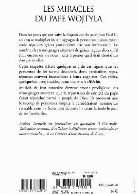 Voici ce que dit la quatrème de couverture: ------------------------- LES MIRACLES DU PAPE WOJTYLA Dans les jours qui ont suivi la disparition du pape Jean Paul II, on a vu se multiplier les témoignages de personnes qui assuraient avoir reçu des grâces particulières par son intercession. Le nombre des témoignages attestant de grâces reçues alors qu'il était encore en vie nous incite à penser qu'il était doté d'un don particulier. Cette enquête décrit quelques-uns de ces signes que les personnes de foi savent découvrir, dons particuliers reçus, réponses souvent inattendues à leurs angoisses. Ces récits, quelquefois inexplicables, nous invitent à réfléchir. Au-delà de leur caractère éventuellement prodigieux, ces témoignages attestent que la réputation de sainteté du pape s'était répandue parmi le peuple de Dieu. Ils prouvent que beaucoup de personnes simples le considéraient comme un véritable saint : « Saint tout de suite ! » criait la foule le jour de ses funérailles.