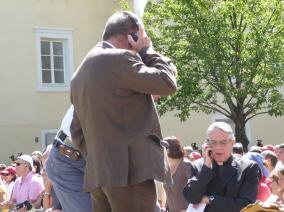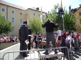 (Franz Giordano, 11/8/20078) Les cloches sonnent à la volée pendant dix minutes. Jusqu'à midi, quand Benoît XVI sort du Dôme et monte sur le podium. Une ovation ouvre le second Angelus du Pontife: la foule des fidèles l'accueille avec une explosion d'applaudissemnts et de banderoles: "Viva il Papa", "Ti vogliamo bene" (nous t'aimons). Une marée de bannières jaunes et blanches recouvrent les différents secteurs, des milliers de bras levés tiennent autant d'appareils photos. Une salve de flashes part, et un choeur s'élève: "Benedetto, Benedetto, Benedetto...". Au coeur de la cité épiscopale, il y a environ 10.000 personnes, 2.000 de plus que dimanche dernier. Ils sont venus de toute l'Italie pour écouter la Messe célébrée par l'évêque Egger, et l'Angelus du Saint-Père.