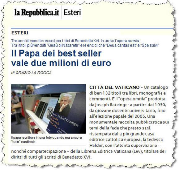 Et la Repubblica titre: Le Pape aux best-sellers vaut 2 millions d'euros... (7/6/2008)
