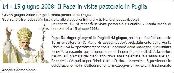 Source: VIS ------------------ - Samedi 14 juin, le Saint-Père partira à 15 h 30' de l'aéroport de Ciampino pour atterrir une heure après à l'aéroport militaire de Galatina d'où il gagnera par hélicoptère Punta Ristola, à Santa Maria di Leuca. - De là, se rendra en automobile au sanctuaire de Santa Maria de Finibus Terræ. - A 17 h 30', il célèbrera la messe sur l'esplanade du sanctuaire. - Le même soir, il retournera à Punta Ristola pour rentrer à Brindisi par hélicoptère où, à 20 h 30', il rencontrera les jeunes avant de dînera à l'évêché.