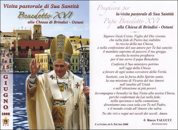 - Dimanche 15 juin, le Pape rencontrera à 9 h 15' les bénédictines et carmélites du diocèse dans la chapelle de l'évêché de Brindisi - A 10 h, il célèbrera la messe sur le quai Saint Apollinaire du port. - Après l'angélus, il retournera à l'évêché où il déjeunera avec les évêques de la région des Pouilles. - A 16 h 45', il rencontrera les prêtres en la cathédrale.