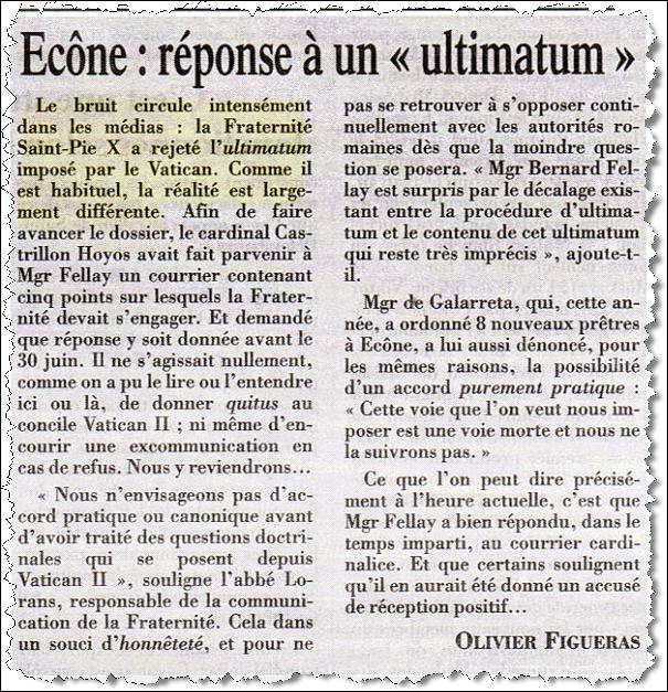 Comme je l'avais écrit la semaine dernière, (Ultimatum du Saint-Siège aux lefebvristes?), le scoop de Tornielli était assez simpliste, et appelait certainement des nuances. Un conflit aussi profond ne peut pas se résoudre en répondant à ce qui était présenté avec la forte charge péjorative que contient le mot "ultimatum" - surtout un ultimatum en cinq points (c'est bien peu!) auquel on n'a que 7 jours pour y répondre (idem).