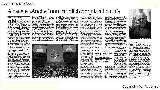 Le célèbre théologien américain: «La prière a Ground Zero et la rencontre avec les victimes des abus sexuels, moments les plus intenses de la visite du Pape » ------------------------- « Je ne crois pas qu'il soit possible de porter un jugement définitif sur le voyage : beaucoup dépendra de l'Église américaine. De la façon dont les prêtres, les évêques et les autres responsables de la pastorale sauront porter au peuple américain le message de Benoît XVI ». Mgr Lorenzo Albacete, théologien américain parmi les plus connus outre-Atlantique, éditorialiste au New York Times et observateur attentif de tout ce qui fermente dans la culture de la bannière étoilée, s'abstient de tout bilan. « Le Pape est venu et a adressé une proposition très claire aux Etats Unis : Christ notre espérance - dit-il, dans sa maison de Yonkers dans l'arrière pays newyorkais. Pas seulement un discours mais un témoignage vécu personnellement, à travers les gestes et les problèmes mis en évidence. Maintenant tout est renvoyé à la liberté des individus ».