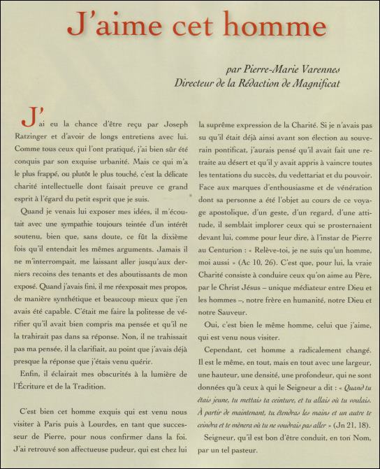 Face aux marques d'enthousiasme et de vénération dont sa personne a été l'objet... d'un geste, d'un regard, d'une attitude, il semblait implorer ceux qui se prosternaient ainsi devant lui comme pour leur dire, à l'instar de Pierre au Centurion: "Relève-toi, je ne suis qu'un homme". |