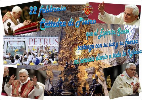 La liturgie latine célèbre aujourd'hui la fête de la Chaire de Saint-Pierre. Il s'agit d'une tradition très ancienne, attestée à Rome dès le IV siècle, par laquelle on rend grâce à Dieu pour la mission confiée à l'Apôtre Pierre et à ses successeurs. La "chaire", en latin "cathedra", est littéralement le siège fixe de l'Evêque, placé dans l'église mère d'un diocèse, qui pour cette raison est appelée "cathédrale", et elle est le symbole de l'autorité de l'Evêque et, en particulier, de son "magistère", c'est-à-dire de l'enseignement évangélique que, en tant que Successeur des Apôtres, il est appelé à garder et à transmettre à la communauté chrétienne. Lorsque l'Evêque prend possession de l'Eglise particulière qui lui a été confiée, il s'assoit sur la chaire en portant la mitre et en tenant la crosse. De ce siège, il guidera, en tant que maître et pasteur, le chemin des fidèles dans la foi, dans l'espérance et dans la charité.