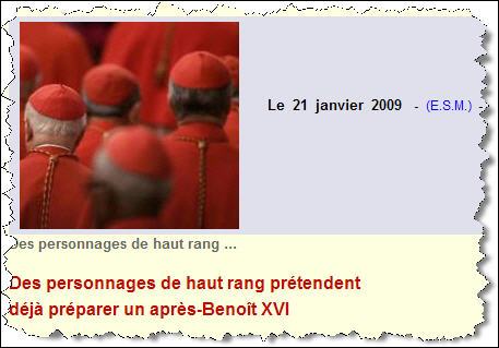 Le second article, publié aujourd'hui est intitulé: Des personnages de haut rang prétendent déjà préparer un après-Benoît XVI. (lien)