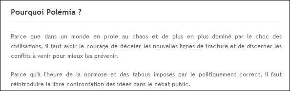 - Polemia: dans une vision ample, de passionnantes analyses politiques, géopolitiques, économiques, sociétales, auxquelles il arrive forcément de toucher l'Eglise