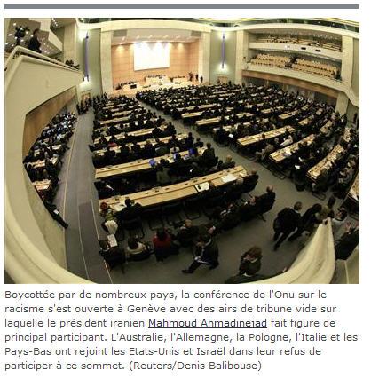 --> D'abord, la conférence de l'ONU dite "Durban II" sur le racisme, qui s'est ouverte à Genève le 20 avril. De nombreux gouvernements occidentaux ont décidé de la boycotter, chacun sait pourquoi. Pas le Saint-Siège! Benoît XVI l'a même évoquée dimanche dernier à Castelgandolfo, après la prière du Regina Caeli (Annexe A)