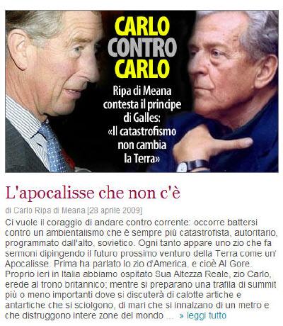 Hier en Italie, nous avons reçu Son Altesse Royale, l'oncle Charles, héritier du trône britannique ; alors que se préparent une série de sommets plus ou moins importants où on discutera de calottes arctiques et antarctiques qui fondent, de mers qui s'élèvent d'un mètre et qui détruisent des zones entières du monde (même l'Italie et la Grande-Bretagne auraient des ennuis), d'augmentation démesurée des populations subordonnés aux risque d'inondation: au cours de ce siècle ils passeront de 5 millions à 370 millions.