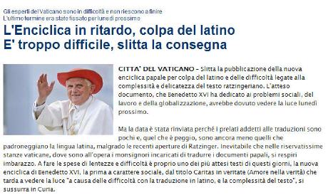 Il y en a qui déplorent, outre-Tibre (Oltretevere), que l'idiome de Cicéron soit devenu très difficile parmi les prélats tout en étant toujours la langue officielle de l'Église catholique et celle de prédilection du Pape : deux ans sont passés depuis que Ratzinger l'a relancée avec le Motu Proprio qui libéralisait la Messe pré conciliaire en latin, très chère aux lefrebvristes et traditionalistes [ndt: on se demande vraiment quel rapport il peut y avoir entre les intégristes et le retard dans la publication de l'encyclique; mais la présence de cette réflexion renseigne sur l'intention de l'auteur].