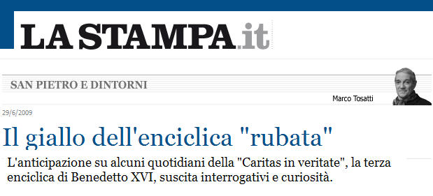 Dès vendredis après-midi, des messagers de confiance ont délivré aux rédactions de quelques quotidiens romains - pas tous - de mystérieuses enveloppes anonymes au contenu « explosif ». A l'intérieur, cinq feuilles, rédigées avec soin, qui constituaient une synthèse et une anticipation, complètées par des passages entre guillemets, de la troisième Encyclique de Benoît XVI, « Caritas in veritate ».