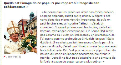 Sans parler de la critique feutrée contre la "piété populaire" décidément mal vue dans un certain milieu ("n'y aurait-il pas eu de lieux symboliquement plus importants"... lesquels?), une critique vraiment pas nécessaire venant d'un clerc dans un pays qu'on dit hyper-déchristianisé, en voilà assez de ces absurdes comparaisons (Benoît XVI règne quand même, et magnifiquement, depuis plus de quatre ans, il faut le rappeler, et ce méchant brouet sent vraiment le réchauffé!) qui ne font que du tort à l'Eglise, et même aux deux papes.