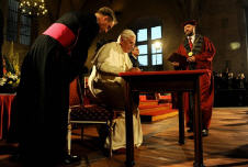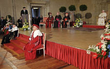 "La grande tradition éducative -a-t-il ajouté- ouverte à la transcendance, qui est à la base des universités à travers l'Europe, a été dans ce pays, et dans d'autres, systématiquement subvertie par l'idéologie réductrice du matérialisme, la répression de la religion et la négation de l'esprit humain. Malgré tout, en 1989, le monde a été témoin, dans des circonstances dramatiques, de l'effondrement d'une idéologie totalitaire en faillite et du triomphe de l'esprit humain. L'aspiration à la liberté et à la vérité est une part inaliénable de notre commune humanité. Elle ne peut être éliminée et, comme l'histoire l'a montré, lorsqu'elle est déniée, c'est au péril de l'humanité même. C'est à cette aspiration que la foi religieuse, les différentes formes de l'art, la philosophie, la théologie et les autres disciplines scientifiques, chacune avec ses propres méthodes, cherchent à répondre, à la fois sur le plan de la réflexion ordonnée que sur celui d'une saine praxis".