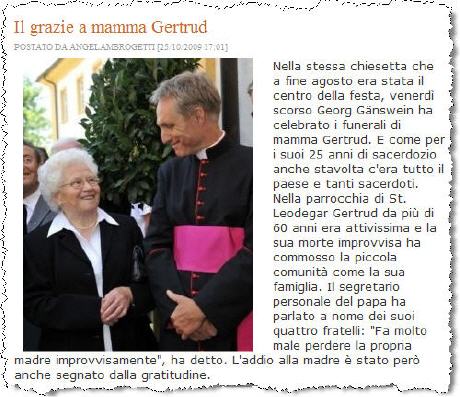 Gertrud Gänswein est décédé subitement le 20 Octobre d'une crise cardiaque. Sa sœur à qui elle s'était adressée car elle ne se sentait pas bien, a été la première à lui porter secours, mais sans pouvoir la sauver.