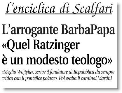 Eugenio Scalfari - à ce qu'il semble - aime les papes, mais seulement ceux qui sont morts et enterrés, et utilisables contre ceux qui vivent (qu'il déteste). Le Repubblica, qu'il a fondée et dirigée pendant des décennies a par exemple (on peut en founir de nombreuses preuves) "bombardé" le Pape Jean Paul II comme réactionnaire, intégriste, anti-communiste, rétrograde. En substance, le Pape Wojtyla était catholique: un péché impardonnable.