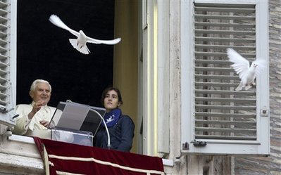 Au moment de libérer les traditionnelles colombes de la paix, celles-ci n'ont pas tout de suite pris leur vol. L'une d'elles s'est arrêtée sur le rebord de la fenêtre, tandis qu'une autre, sans doute avec la complicité du froid romain, a préféré rentrer vers les chauds appartements du Vatican.