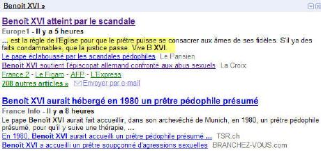Sans rentrer dans le détail des titres honteux de la grosse presse, je ne peux m'empêcher de voir un signe dans le premier qui me tombe sous les yeux, sur la page d'actualités de Google. Venant d'Europe 1, on s'attend à l'habituel tombereau d'ordures. Eh bien non! Par la magie du robot qui indexe les articles, on est renvoyé à un lien, où l'on peut lire, avec autant de stupéfaction que de soulagement, sous le titre prévisible "Benoît XVI atteint par le scandale", ce formidable cri du coeur d'un internaute de passage sur le site: