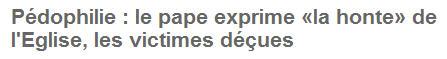 L'autre titre qui a été répété en boucle par les medias, et qui contredit en partie le premier (mais peu importe, l'essentiel étant d'humilier le Pape et de le faire passer pour coupable) est "Le Pape a honte". Comme s'il s'agissait d'une faute qui lui était personnelle. Or, Benoît XVI a écrit: [Au nom de l'Eglise], je vous exprime ouvertement la honte et le remord que nous éprouvons tous .