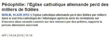 Beaucoup d'allemands auraient, selon les medias, quitté récemment l'Eglise. Ce qu'ils oublient de dire, c'est que les raisons sont essentiellement fiscales. Et que les établissements d'enseignement catholiques impliqués dans les "scandales pédophiles" enregistrent un boum de demandes d'inscription! (23/4/2010)